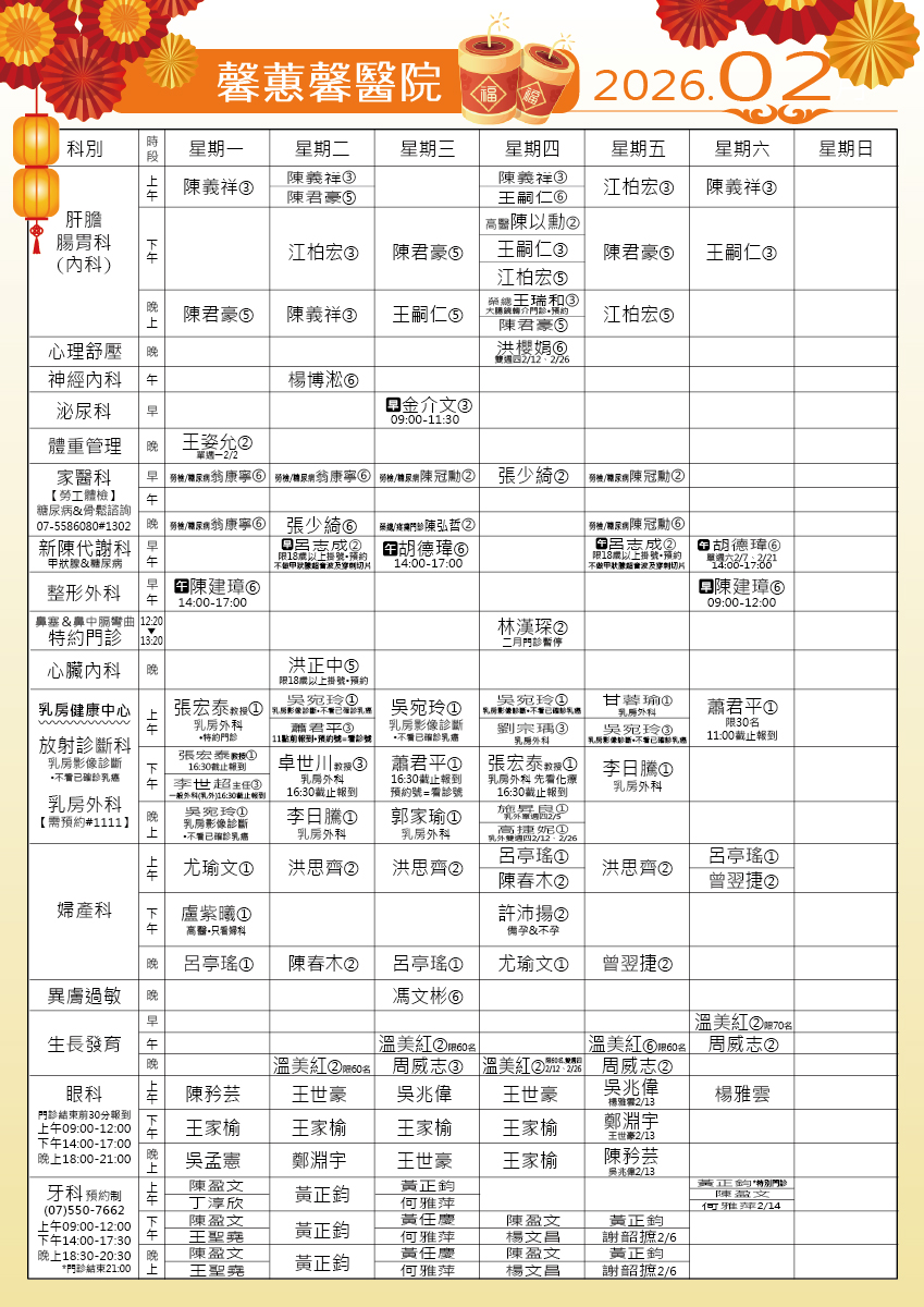 -本門診表為每月固定之門診表,如有臨時門診異動請參照網路掛號門診表。 -門診開始時間:上午09:00、下午14:00、晚上18:30 -門診"掛號截止"時間:上午11:50、下午17:10、晚上21:10(已掛號者請於截止時間前至櫃台報到) -健保身份就醫時請攜帶健保卡,健保卡無照片者須攜帶身份證明文件。 -卡介苗僅限【博愛蕙馨醫院】施打,每週二及週五-上午 112年3月開始:改為上午09:00-10:30施打(10:20報到截止)。