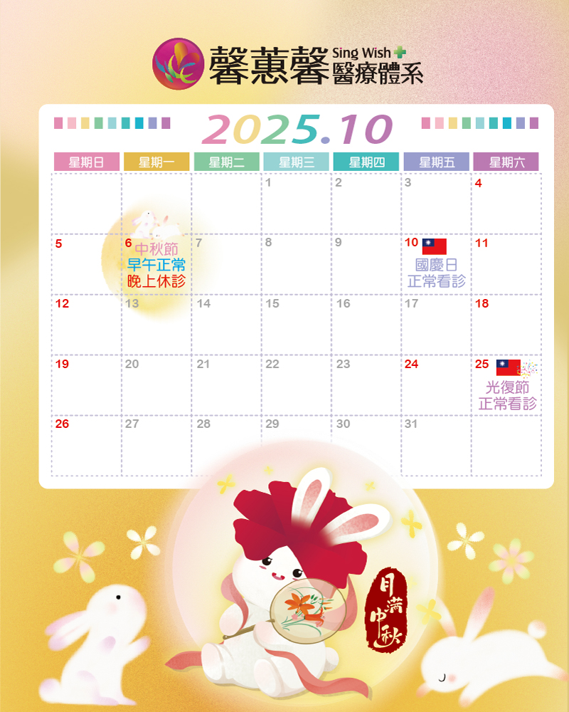 中秋節|國慶日|光復節|門診公告 馨蕙馨醫院、博愛蕙馨醫院、彌馨診所 ●中秋節連假→10/04(六)~10/05(日):正常看診 10/06(一) 早、午正常看診 晚上停診 ●10/10~10/12 國慶日→正常看診 ●10/24~10-26 光復節→正常看診 博愛蕙馨醫院 24 小時急診接生 是全年無休的呦!祝大家中秋節快樂